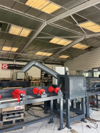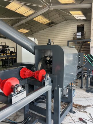 Our automatic debarking line consists of a motorized diabolos input conveyor, a disk debarker with variable capacity depending on the wood diameters, and a motorized diabolos output conveyor, often equipped with an automatic ejector.